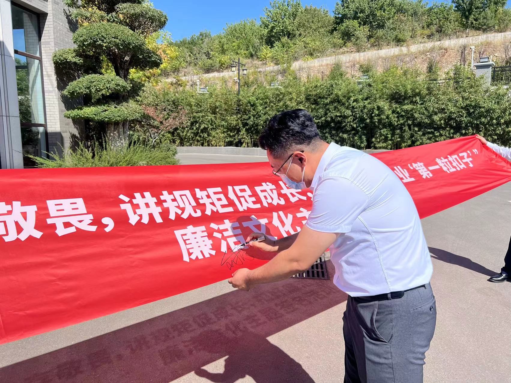 年輕干部在印有“守初心存敬畏,講規(guī)矩促成長,扣好廉潔從業(yè)‘第一粒扣子’”的廉潔文化宣傳教育月主題橫幅上鄭重簽下自己的名字,表達(dá)了筑牢思想道德防線、增強(qiáng)廉潔自律意識的堅(jiān)定信念。
